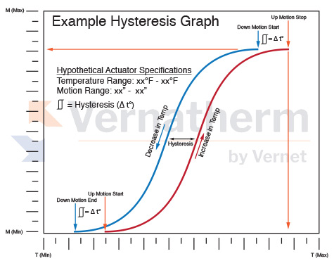 An actuator's piston extends when it senses thermal increase and retracts when it is cooled. The temperature points when this occurs are not identical. The difference between the two points is called "hysteresis". Hysteresis is deliberate and will prevent unnecessary switching/modulation between temperatures that frequently fall above and below a set point. Utilize the hypothetical graphed performance curve on the left to further understand this concept.